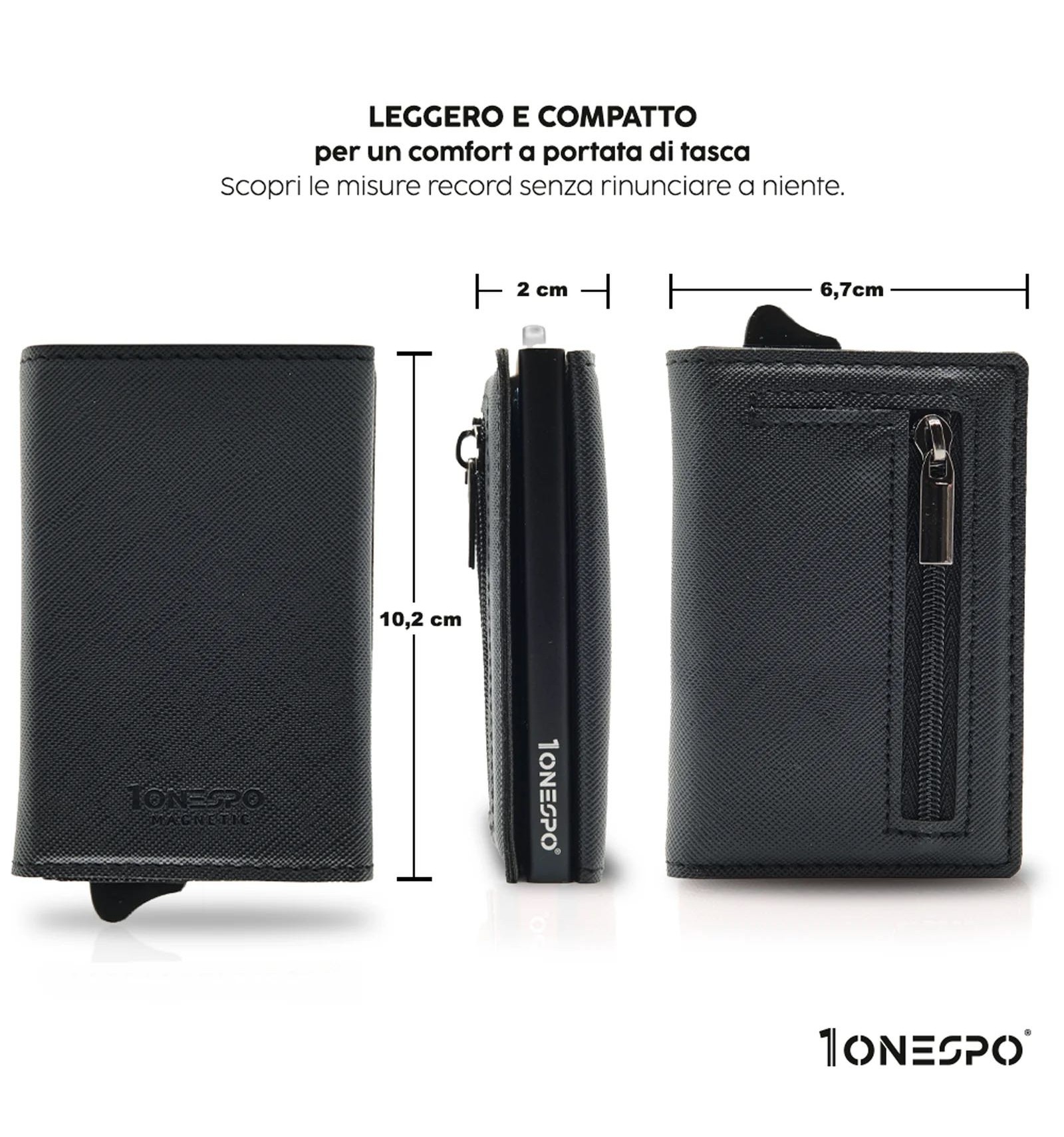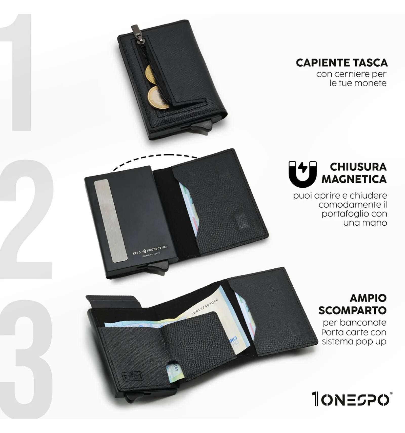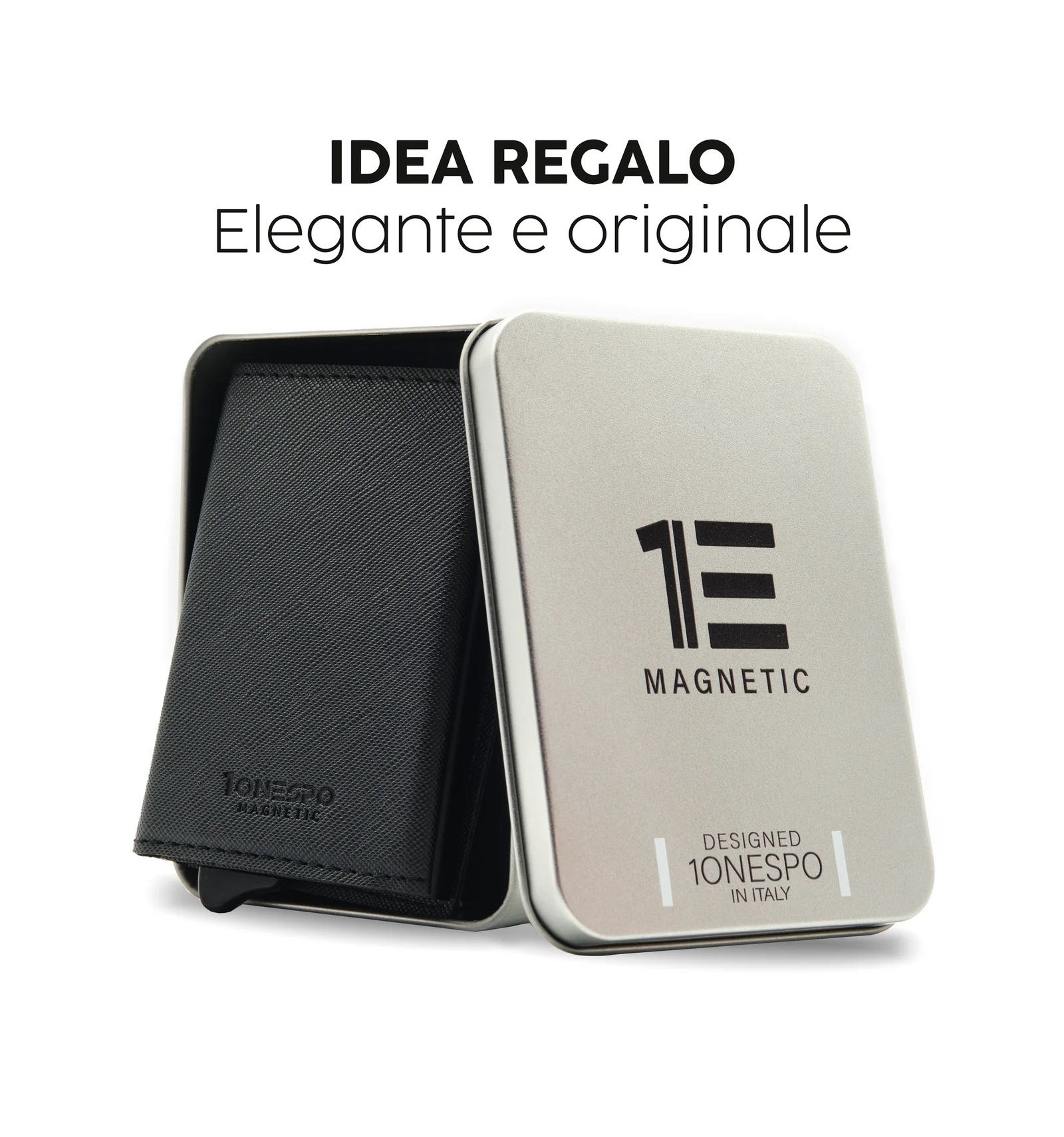 Art. - DESCRIZIONE:-1ONESPO® MAGNETIC, portafoglio in Vera Pelle, Saffiano Nero, cuciture tono su tono. -Chiusura magnetica -Custodia in alluminio Protezione RFID per 6 carte 1 tasca interna per altre carte -Porta spiccioli con chiusura a cerniera -Porta contanti in Vera Pelle Saffiano -Compatibile con: carta d'identità elettronica, patente, tessera sanitaria e carte di credito o di debito, biglietti da visita ed assegni -Dimensioni portacarte: 10x6,5x2,7cm -Inclusa elegante e raffinata scatola regalo metallica