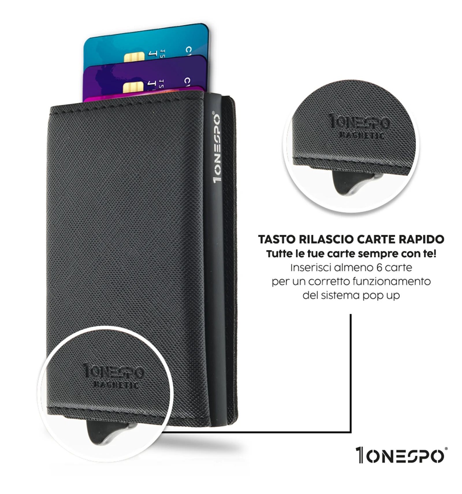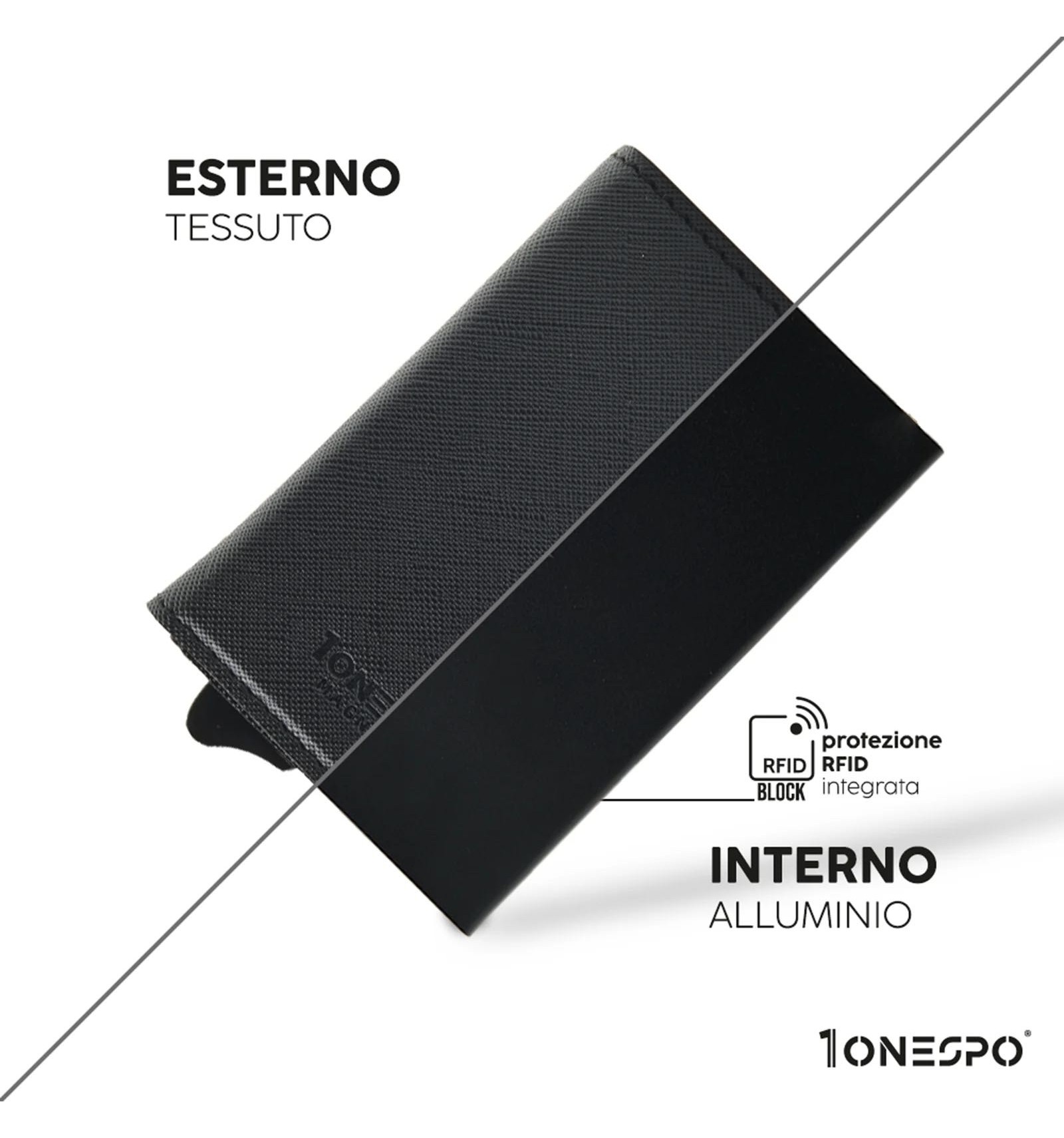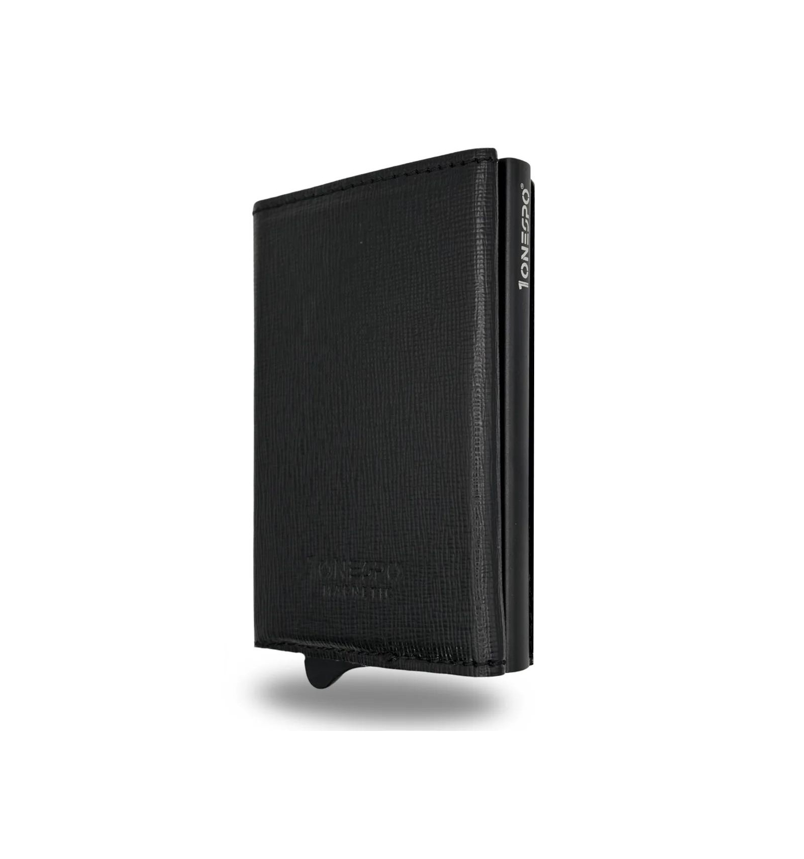 Art. - DESCRIZIONE:-1ONESPO® MAGNETIC, portafoglio in Vera Pelle, Saffiano Nero, cuciture tono su tono. -Chiusura magnetica -Custodia in alluminio Protezione RFID per 6 carte 1 tasca interna per altre carte -Porta spiccioli con chiusura a cerniera -Porta contanti in Vera Pelle Saffiano -Compatibile con: carta d'identità elettronica, patente, tessera sanitaria e carte di credito o di debito, biglietti da visita ed assegni -Dimensioni portacarte: 10x6,5x2,7cm -Inclusa elegante e raffinata scatola regalo metallica