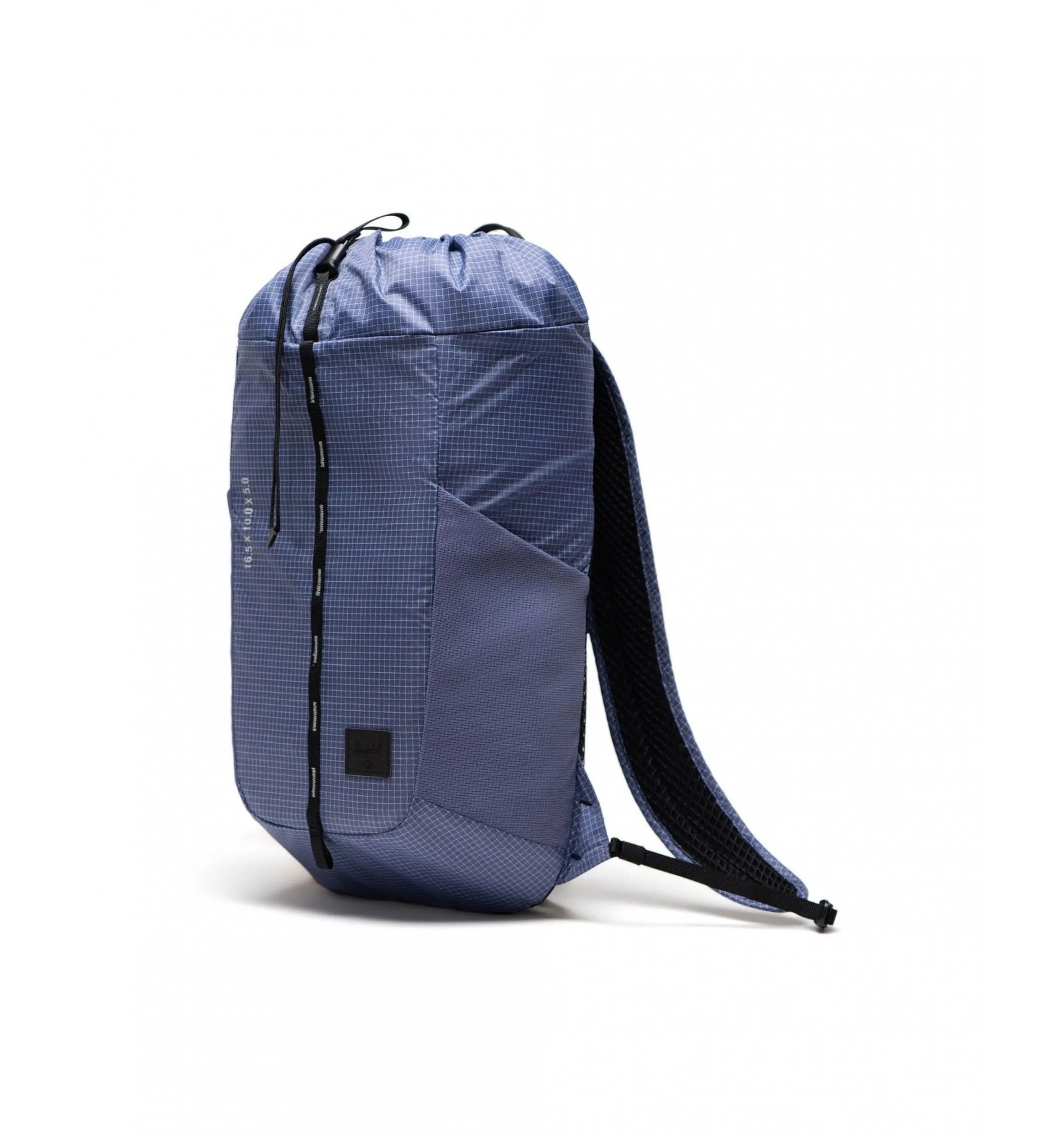 Art. - Reflective dimensions screen print detail 94% nylon, 6% polyester ripstop fabric 100% recycled polyester liner coated with polyurethane Abrasion-resistant nylon webbing Reflective tabs for enhanced visibility Drawcord closure Top carrying handle Contoured and adjustable air mesh shoulder straps Removable sternum strap with a 105 dB rescue whistle Removable waist strap adjusts to keep bag secure Air channel mapping EVA-padded back panels Built-in hydration system with internal reservoir pocket Power mesh water bottle pockets expand to fit a water bottle up to 3" in diameter Zippered hanging pocket with key clip Herschel Outdoor Equipmentâ„¢ label